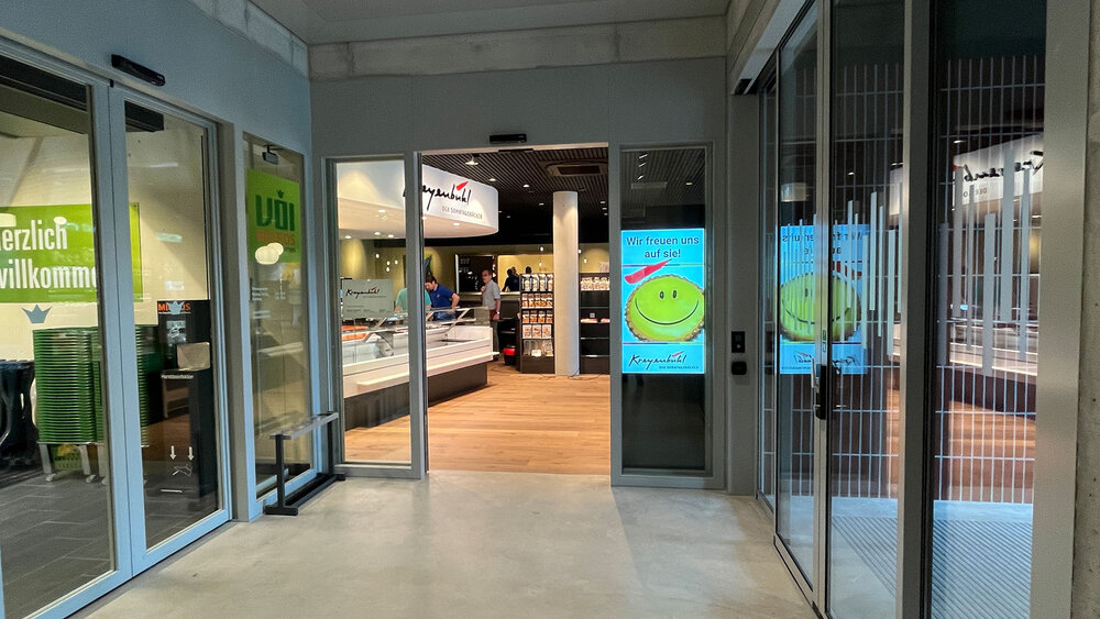 Bei der Bäckerei Kreyenbühl wir der neue Bildschirm im Eingang verwendet um die Kunden zu begrüssen und über Produktenews und Aktionen zu informieren. Ein echtes Highlight bei diesem Projekt ist aber die Installation. Das Gerät kann auf Schienen zwischen Verglasung und Kühltruhe ganz einfach rein und raus geschoben werden.